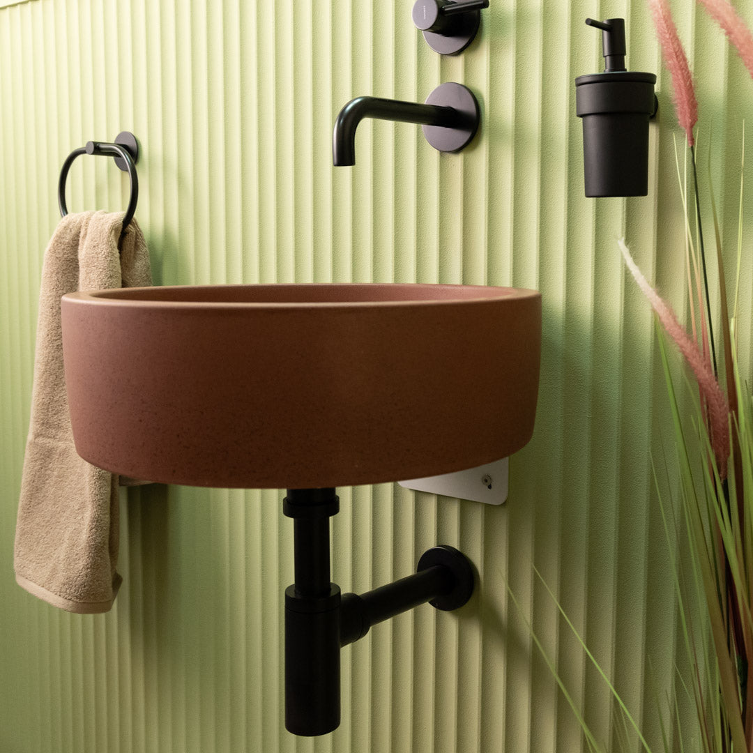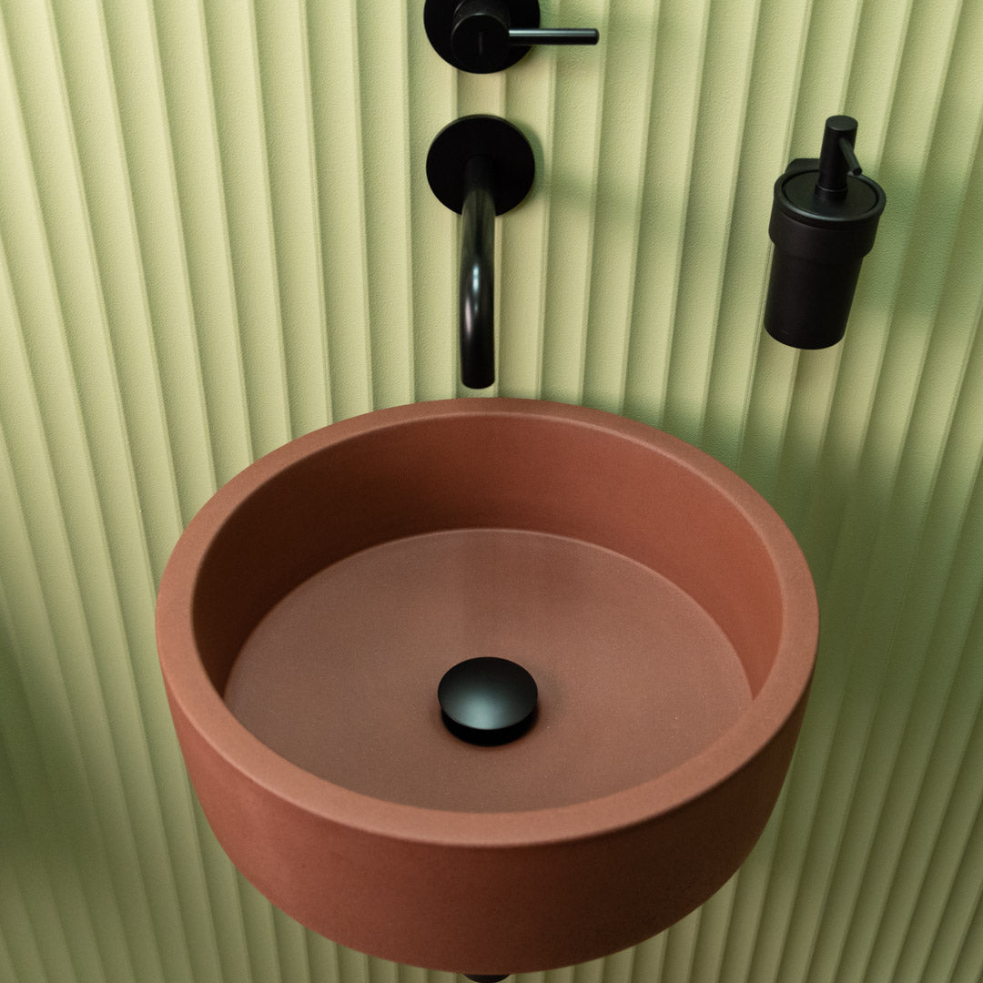 Crafted by hand from high-quality concrete, this round sink features soft edges and a smooth matte finish that suits a wide range of interior styles. Each basin is unique, displaying natural tonal variations and surface markings that emphasize its handcrafted character. Designed for easy countertop installation, it offers both durability and understated elegance for everyday use.