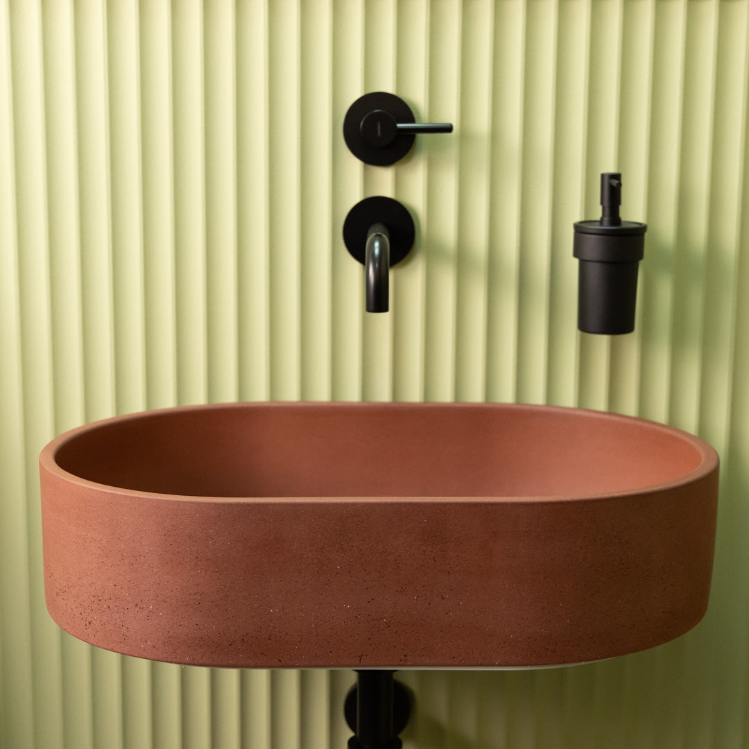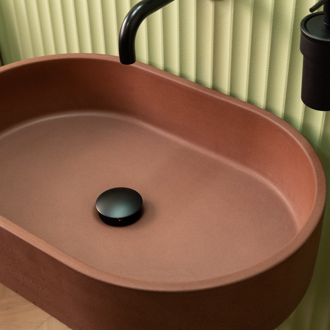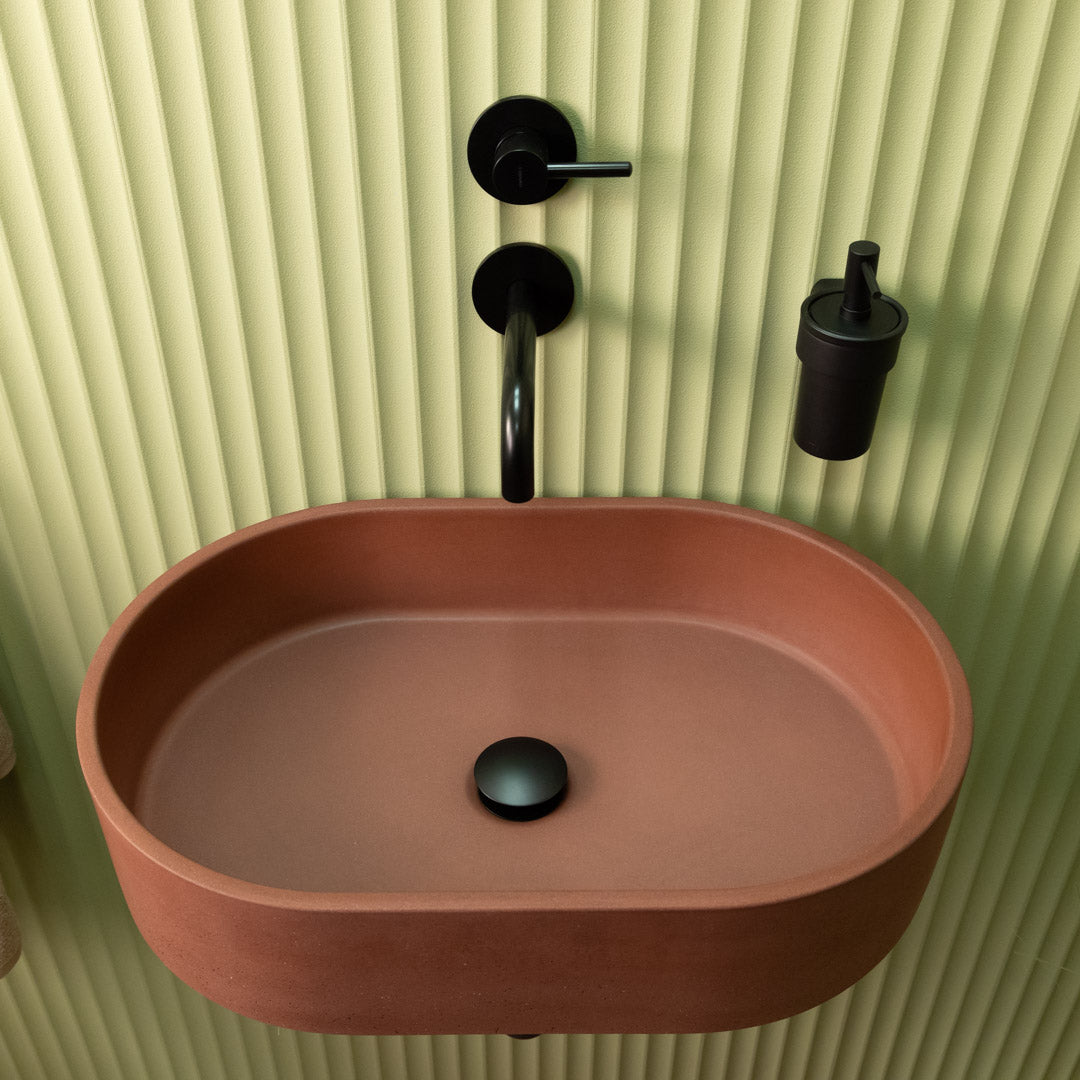 Handgefertigt aus hochleistungsfähigem GFRC (glasfaserverstärktem Beton) vereint dieses ovale Betonwaschbecken Langlebigkeit mit anspruchsvollem Design. Seine glatte, matte Oberfläche und organischen Kurven passen perfekt zu modernen und minimalistischen Innenräumen. Jedes Stück ist ein Unikat, mit subtilen Variationen in Farbton und Textur, die seinen handgefertigten Charakter widerspiegeln. Für eine einfache Montage auf der Arbeitsplatte konzipiert, ist es eine praktische und elegante Wahl für jedes Badezimmer.