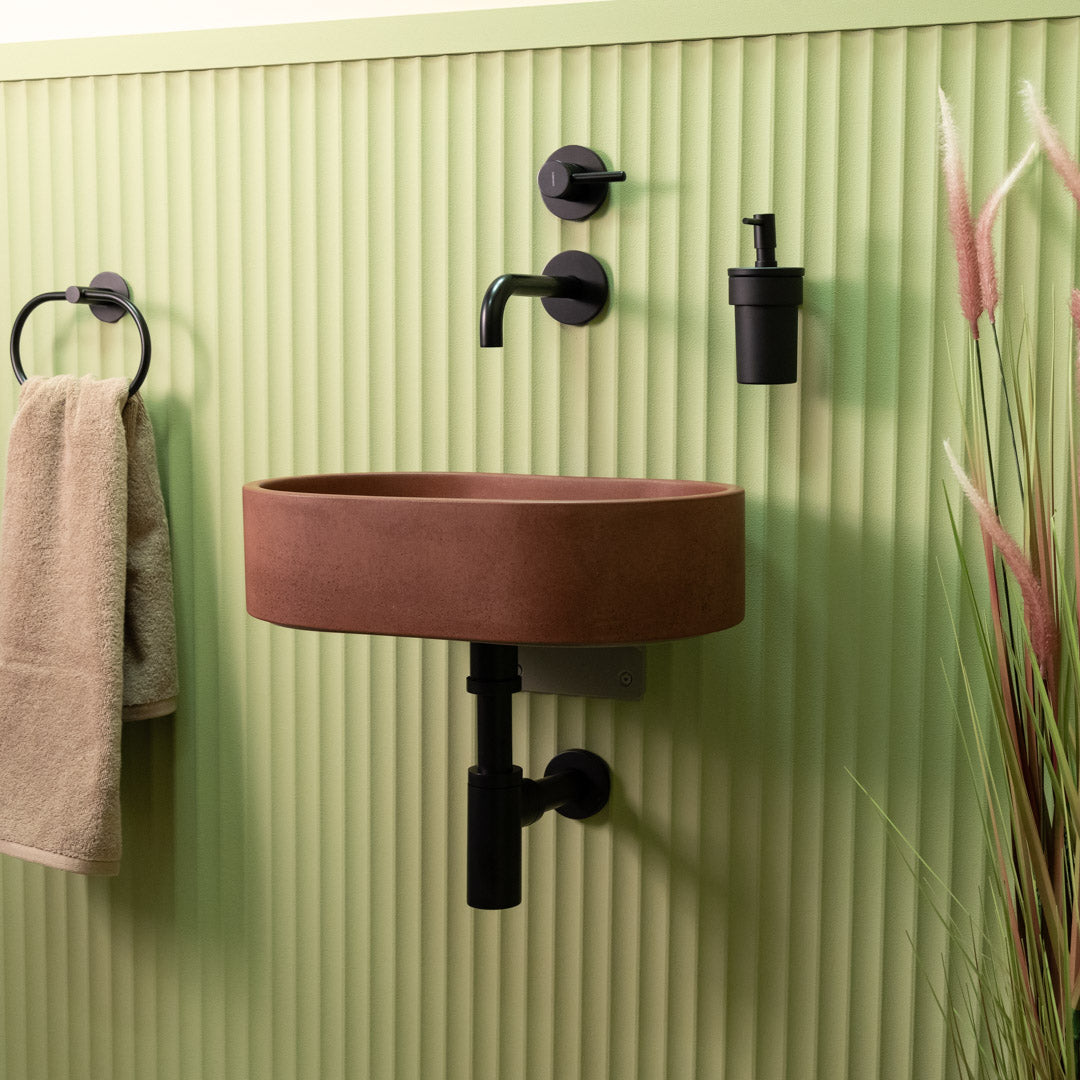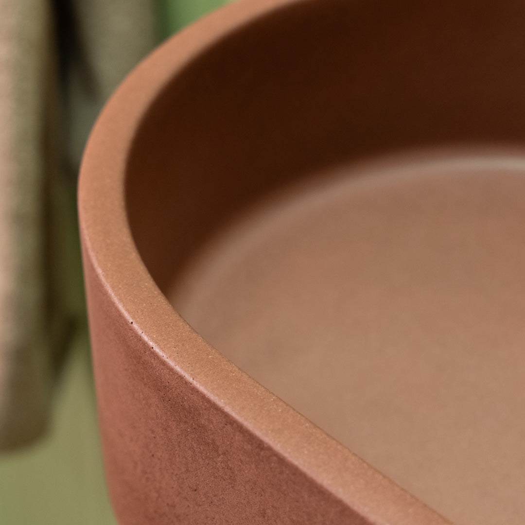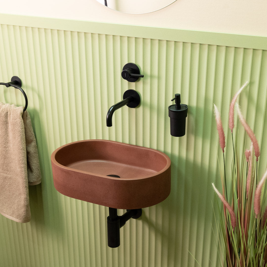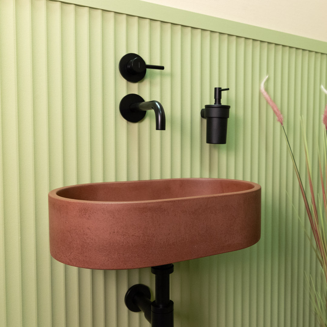 Handgefertigt aus hochwertigem Beton besticht das Mini Halo-Waschbecken durch ein kompaktes Oval-Design, das sich perfekt in kleineren Badezimmern einfügt. Seine glatte, matte Oberfläche und klaren Konturen verleihen jedem Raum einen modernen, edlen Touch. Jedes Becken ist ein Unikat und zeigt natürliche Variationen in Farbton und Textur. Für die einfache Montage auf der Arbeitsplatte konzipiert, vereint es Langlebigkeit und optische Ausgewogenheit im platzsparenden Format.